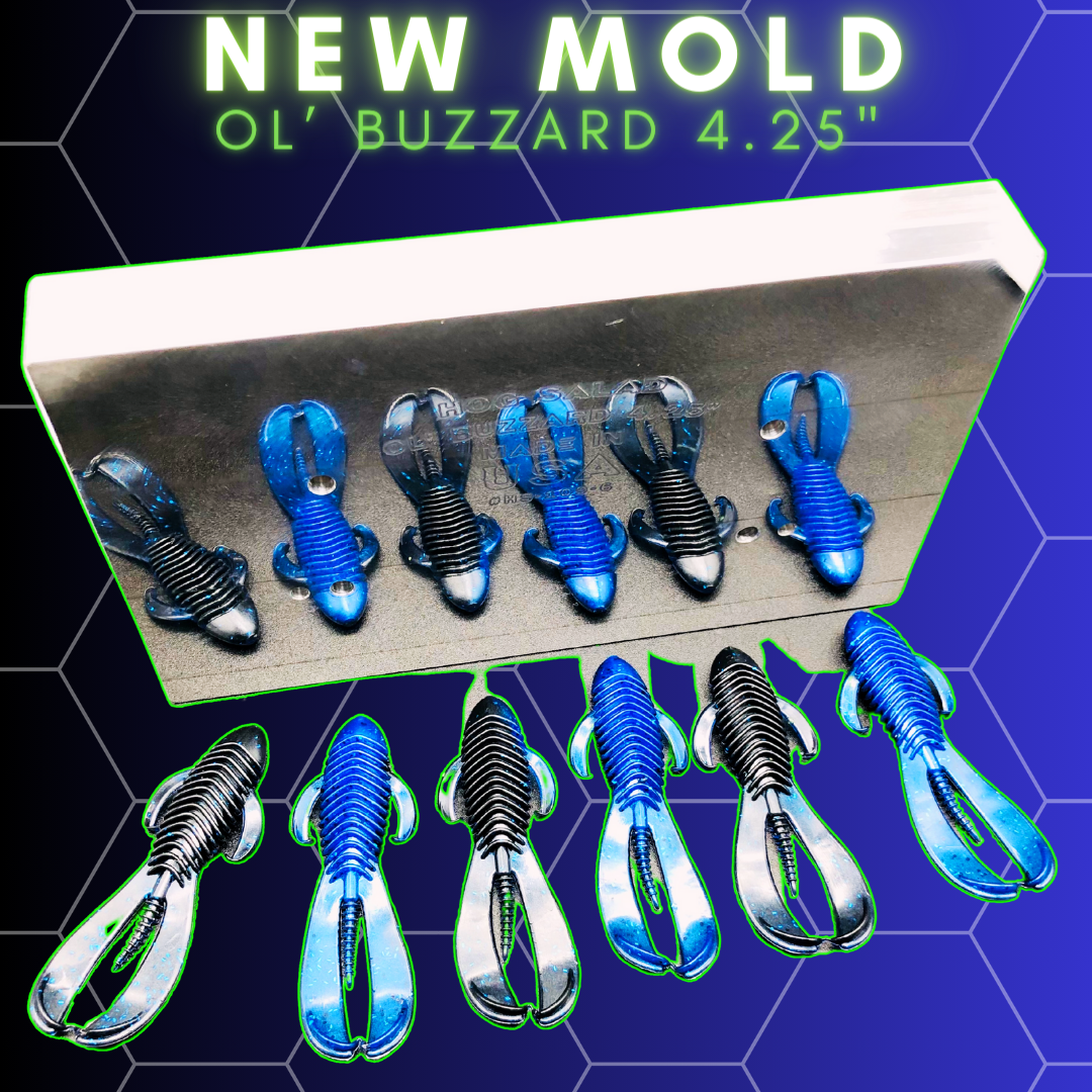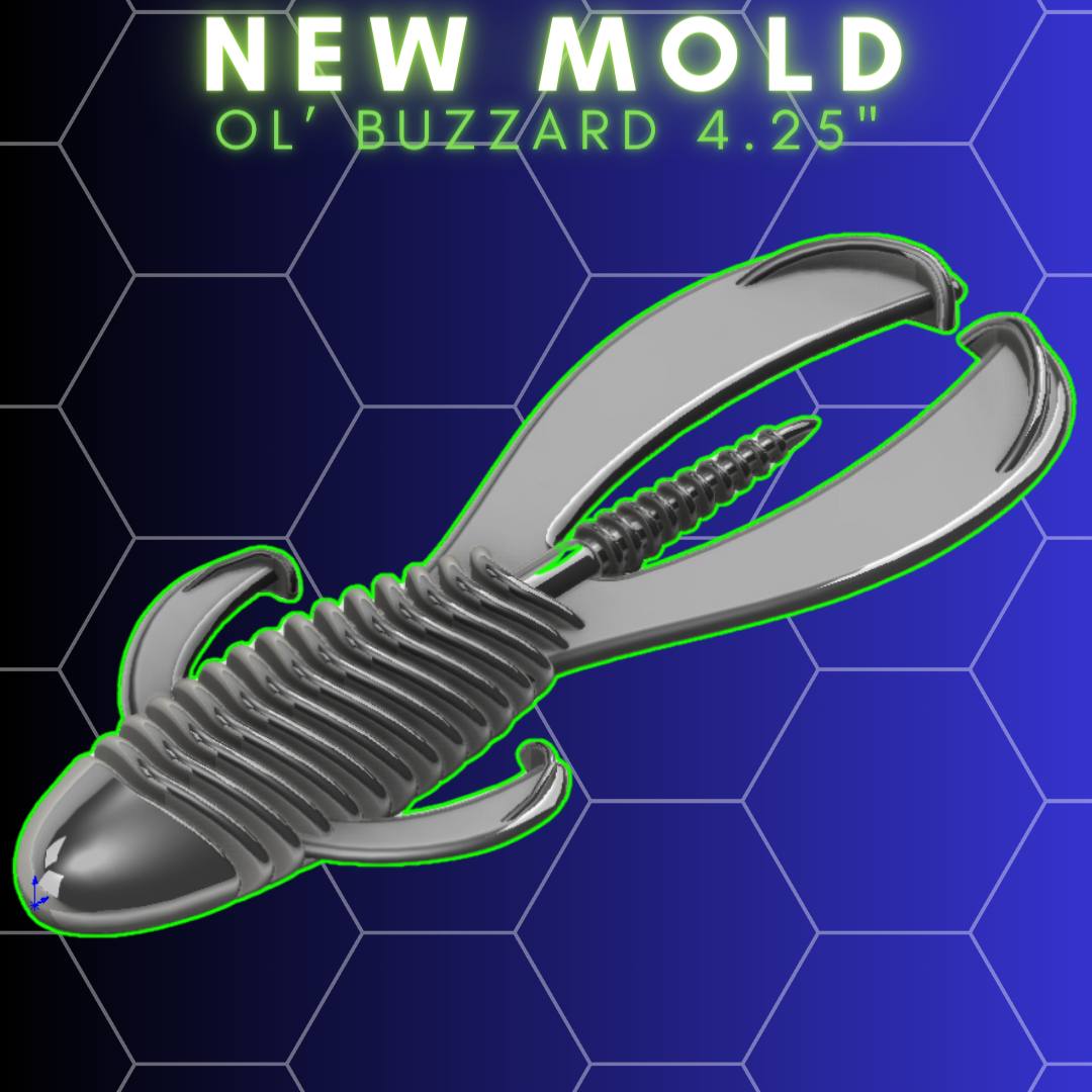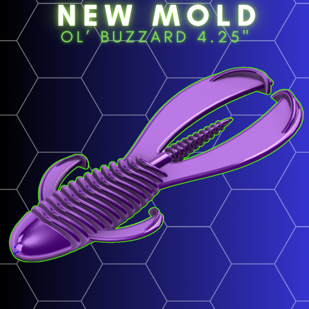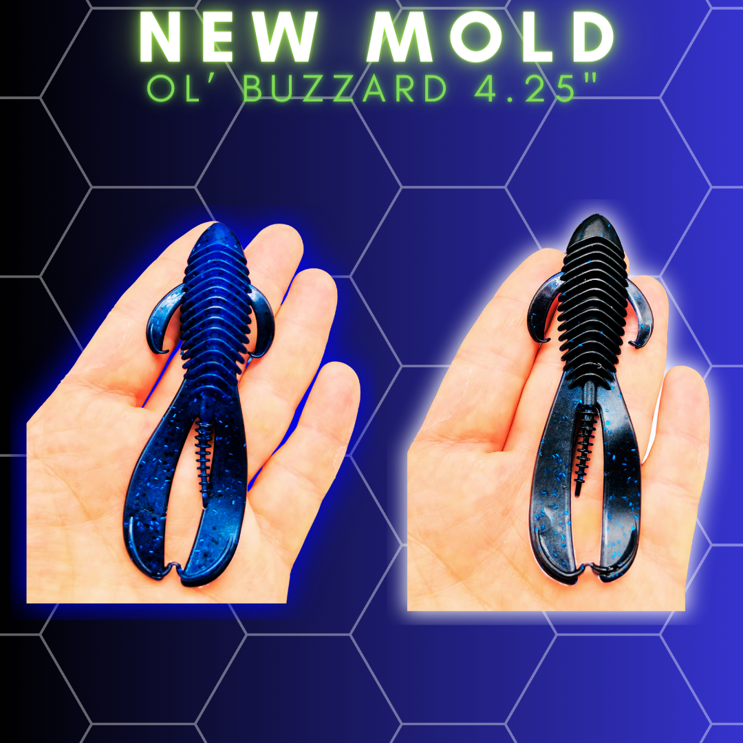 The body is ribbed for maximum water displacement and the tail great motion through the water! The side arms/legs have a subtle movement to give the bait more realism and action. At 4.25" inches in length, the Ol' Buzzard 4.25" is an ideal size for targeting medium to large Largemouth and Smallmouth Bass. The bait's lifelike appearance and natural, realistic action make it highly effective in a range of fishing scenarios, especially when fishing in areas where crawfish & frogs are present.